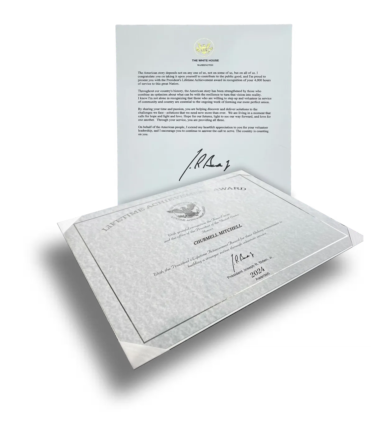The American story depends not on any one of us, not on some of us, but on all of us. I congratulate you on taking it upon yourself to contribute to the public good, and I'm proud to present you with the President's Lifetime Achievement award in recognition of your 4,000 hours of service to this great Nation.